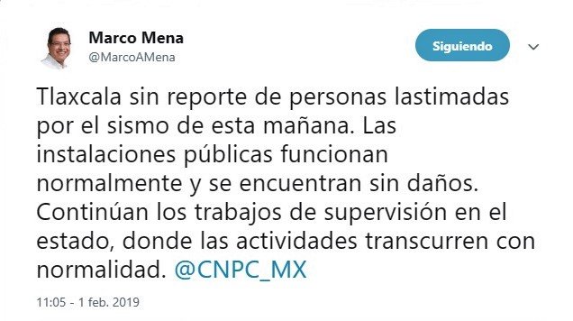 En su cuenta de Twitter, el Gobernador Mena escribió: “Tlaxcala sin reporte de personas lastimadas por el sismo de esta mañana. Las instalaciones públicas funcionan normalmente y se encuentran sin daños. Continúan los trabajos de supervisión en el estado, donde las actividades transcurren con normalidad. @CNPC_MX.
