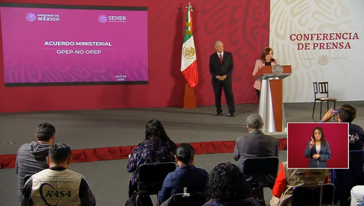 El presidente estuvo acompañado por los titulares de la Secretaría de Energía (Sener), Roció Nahle, y de Petróleos Mexicanos (Pemex), Octavio Romero, quienes acudieron a Palacio Nacional a presentar el resultado de las negociaciones que tuvo México en la OPEP para limitar la producción de petróleo a nivel mundial.