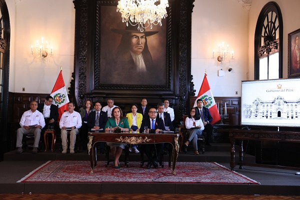‘Anuncian con llegar a Lima desde el Vraem [Valle de los Ríos Apurímac, Ene y Mantaro] queriendo tomar desde el centro a todo el país. Esa es una amenaza a la democracia, al Estado de derecho, a la institucionalidad. Y nosotros como Gobierno democrático no lo vamos a permitir, ni aceptar’, afirmó Boluarte.