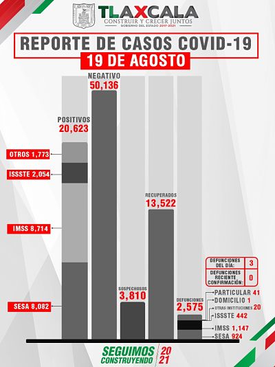 De acuerdo con el reporte del 19 de agosto, la Secretaría de Salud del Estado (SESA) confirmó 28 personas recuperadas, tres fallecimientos y 119 casos positivos de Covid-19 de tlaxcaltecas identificados en el estado y uno en otra entidad.