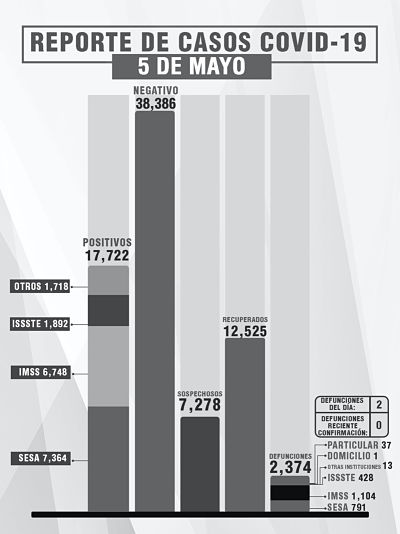 Mientras, del total de fallecimientos, 791 se han registrado en la SESA, mil 104 en el IMSS, 428 en el Issste, 13 en otras instituciones, uno en domicilio particular y 37 en hospital privado.