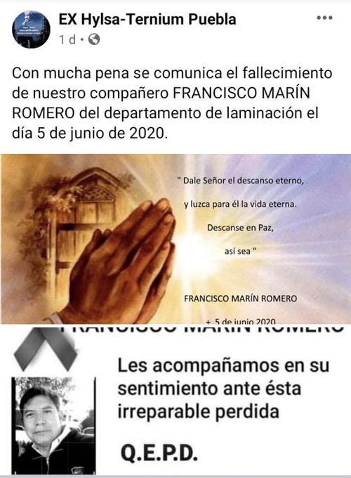 Le comparto el caso de trabajadores de la planta Puebla de Ternium que viven con angustia porque el pasado viernes 5 de junio se registró el fallecimiento de uno de sus compañeros, Francisco Marín, quien laboraba en el área de laminación.