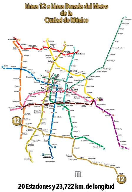 También conocida como ‘Línea dorada’ corre de la estación Mixcoac, y hasta Tláhuac, su estación número 20. Del total, cuatro son de correspondencia, 15 de paso y hay una terminal.