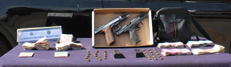 Durante la implementación del protocolo de actuación policial, los elementos hallaron entre las pertenencias de los varones dos armas de fuego calibre 9 milímetros, 29 cartuchos útiles y poco más de un millón de pesos en efectivo. Al no poder comprobar la legal procedencia de las armas y del dinero descrito, se procedió a la detención de Sergio “N.” y Jesús “N.”.
