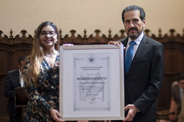 Por su talento, destacada trayectoria académica, alta competencia y vocación, y por ser la primera científica mexicana galardonada por la Fundación Von Behring-Röntgen con el premio Von Behring-Röntgen Young Talent Award 2019, una de las más altas distinciones médicas en Alemania, el Rector Alfonso Esparza Ortiz entregó un reconocimiento a la doctora Karla María Rubio Nava, egresada de la Licenciatura en Biomedicina de la Facultad de Medicina y de la Maestría en Ciencias Fisiológicas del Instituto de Fisiología de la BUAP.