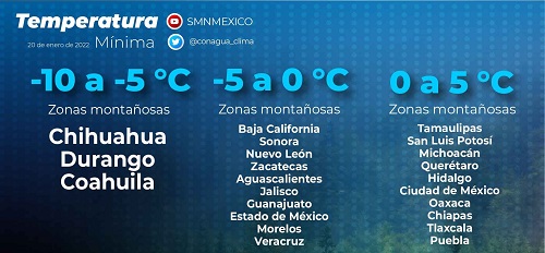 En cuanto a los termómetros, los registros más bajos se prevén en las partes altas de Chihuahua, Durango y Coahuila, donde irán de -10 a -5ºC en las horas más frías del día. También estarán por debajo del punto de congelación en las sierras de Baja California, Sonora, Nuevo León, Zacatecas, Aguascalientes, Jalisco, Guanajuato, Estado de México, Morelos y Veracruz, moviéndose de 0 a -5ºC.