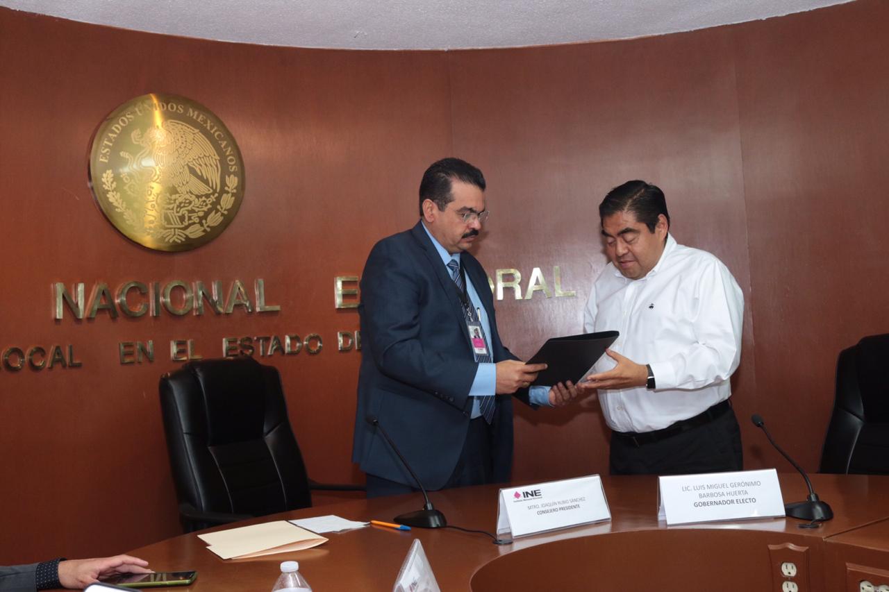 Luego de recibir de manos del vocal Ejecutivo del INE, Joaquín Rubio Sánchez la Constancia de Mayoría que lo acredita como Gobernador electo de Puebla, Barbosa Huerta hizo un llamado a todas las fuerzas políticas a cambiar la entidad y estar más cercanos a la gente, en el que reconoció también que el gobierno debe cambiar por el bien del pueblo, ya que hay una distancia entre el gobierno público y el ejercicio de la autoridad para con sus gobernados, que es lo que ha originado un distanciamiento y hartazgo.