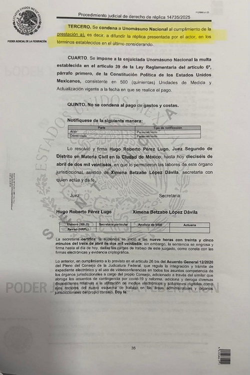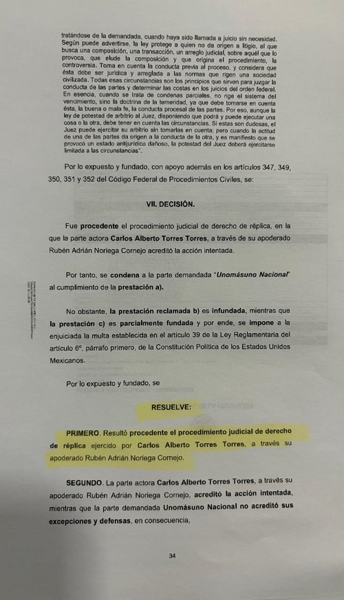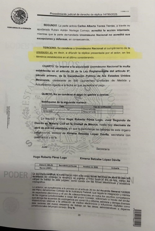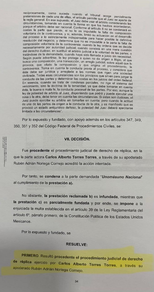 El Juzgado Segundo de Distrito en Materia Civil en la Ciudad de México declaró procedentes los procedimientos judiciales de derecho de réplica promovidos por Carlos Alberto Torres Torres, a través de su apoderado Rubén Adrián Noriega Cornejo, en contra de Unomásuno Nacional.