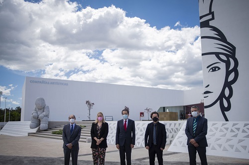 El edificio se ubica al centro de una explanada con un espejo de agua, jardineras, bancas y una escultura Timoteo, del artista Rodrigo de la Sierra, ‘el cual no tiene rasgos faciales, porque lo que busca es que la cara se la ponga el público, pero la cara que va a dar es la que estas compañías siempre ofrecen y el talento que les ha distinguido, de manera que no podría haber una obra más adecuada para este espacio’, destacó el rector Esparza.