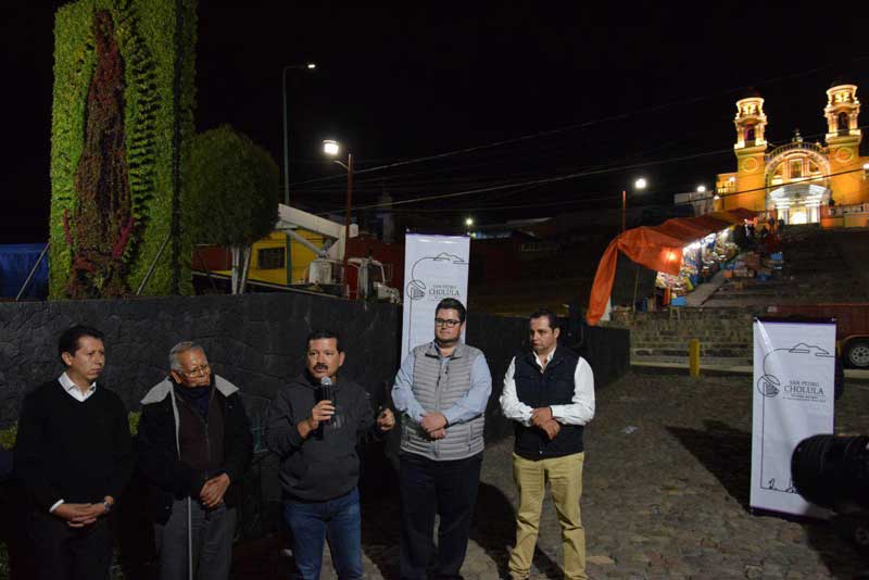 El Presidente Municipal de San Pedro Cholula, Luis Alberto Arriaga Lila, hizo entrega de la iluminación del Santuario de Guadalupe, donde se colocaron y repararon más de 140 puntos de luz; así como una escultura hecha con plantas, colocada al exterior de la iglesia.