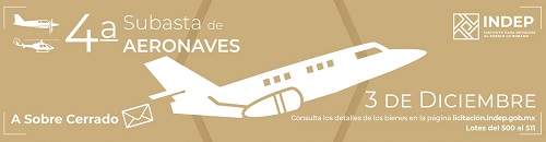 El Instituto para Devolver al Pueblo lo Robado (Indep) informó este domingo que el próximo 3 de diciembre se llevará a cabo la Cuarta Subasta de Aeronaves en las instalaciones del Aeropuerto Internacional Benito Juárez de la Ciudad de México.
