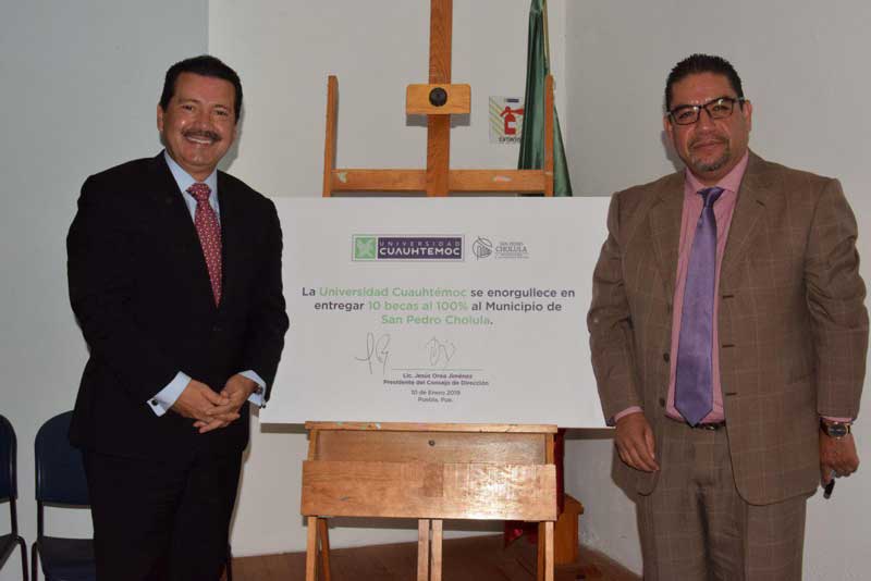 Con el objetivo de promover e incentivar la educación entre los jóvenes cholultecas, el ayuntamiento de San Pedro Cholula, a través del presidente municipal Luis Alberto Arriaga Lila, firmó un convenio de colaboración con la Universidad Cuauhtémoc, campus Puebla, donde se otorgan 10 becas para licenciatura, con cobertura del 100 por ciento, durante toda la carrera, a estudiantes de escasos recursos de juntas auxiliares, que deseen continuar con su desarrollo académico.