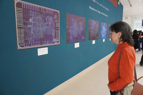 Tras su apertura, la rectora Lilia Cedillo Ramírez recorrió cada uno de estos planos y mapas con fondo azul y líneas blancas, que son reproducciones de documentos históricos cuyos originales están bajo el resguardo de la Mapoteca Jorge A. Vivó Escoto, del Instituto de Ciencias de la BUAP.