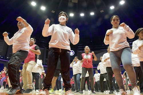 Los más de 500 administrativos reunidos en la Arena BUAP, directores, funcionarios universitarios y la Rectora de la BUAP realizaron una activación física como muestra de las dinámicas incluidas en BIBeS TU, ejercicios de cardio box y baile fitness, por ejemplo, con una duración de 30 minutos.