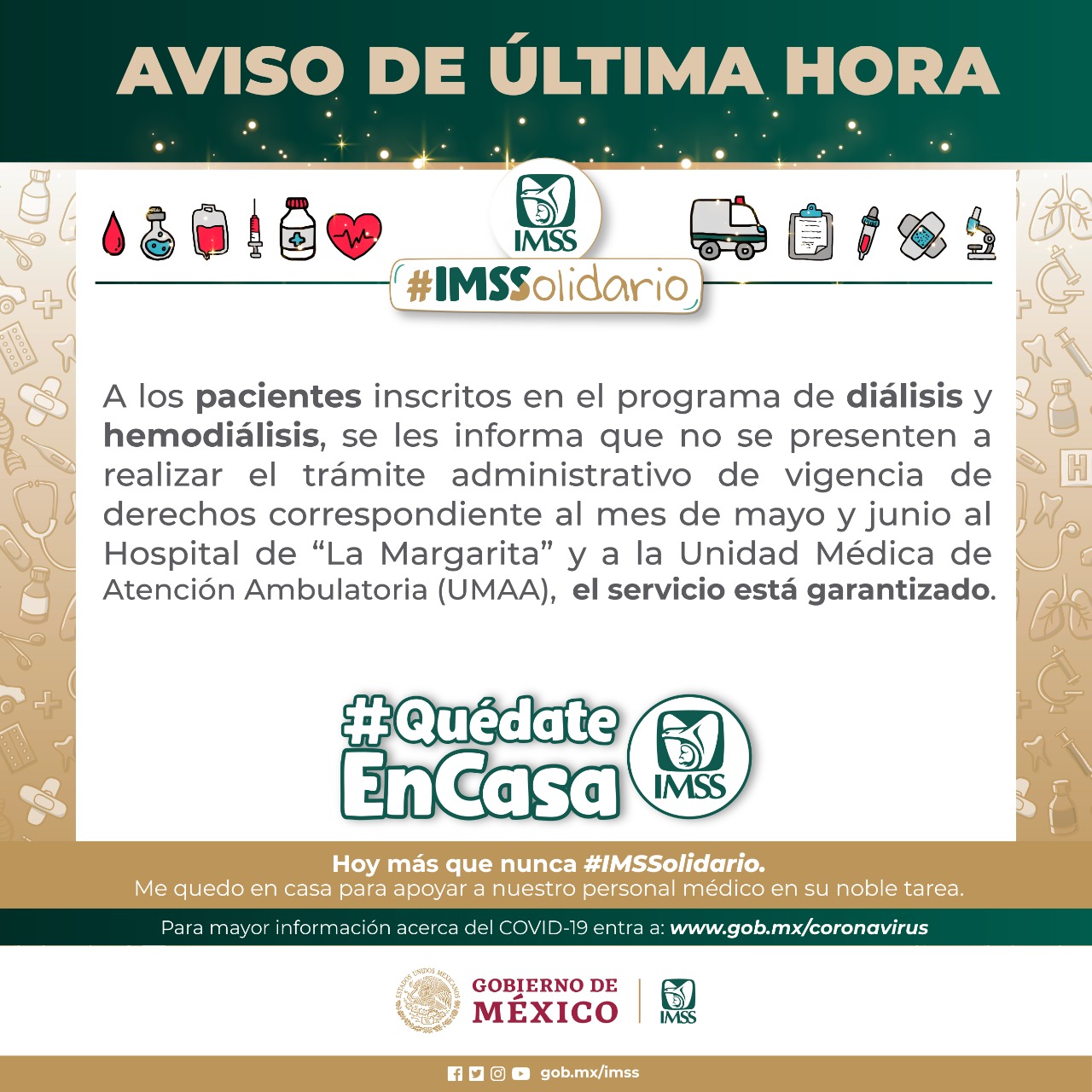 El Hospital General de Zona (HGZ) No. 20 “La Margarita” y la Unidad Médica de Atención Ambulatoria (UMAA), del Instituto Mexicano del Seguro Social (IMSS), informan a todos los derechohabientes que pertenecen al programa de diálisis y hemodiálisis, que derivado de la emergencia sanitaria, no es necesario presentarse en el nosocomio para realizar el trámite administrativo de vigencia de derechos, correspondiente a los meses de mayo y junio.