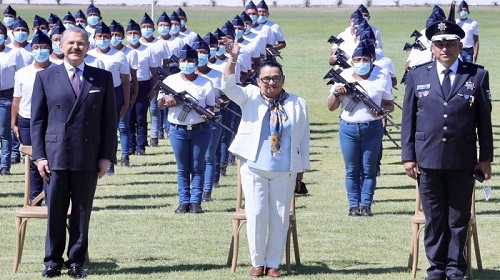 Este jueves, en el Centro de Formación Teotihuacán, la secretaria fue nombrada madrina de la generación y recibió obsequios de los cadetes como una charola conmemorativa y un cuadro realizado por el cadete Alfredo Durán Alvarado.