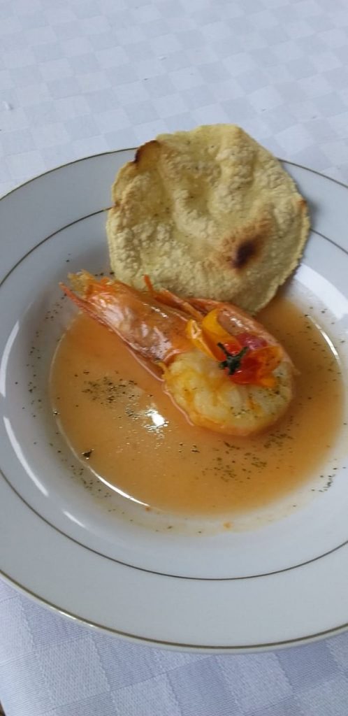 Se limpia el camarón, se le quita el bigote y la cola. Se pone a hervir. Se muele el tomate, chile y el ajo; se agrega cuando esté a medio hervir el caldo. Al soltar el hervor se le pone la masa disolviéndola poco a poco y checar que no quede muy espeso. Se deja hervir y que la masa se cosa bien. Se le agregan las hojas de aguacate y se saca. Se como con tortillas calientes.
