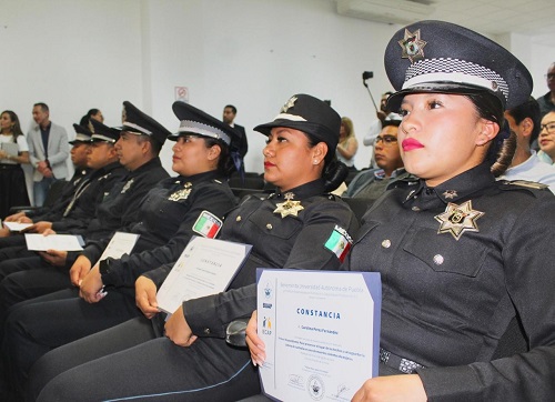 En el evento estuvieron presentes Luis Flores Fierros, secretario de Seguridad Pública y Protección Ciudadana; Rafael Cuautli Deaquino, regidor presidente de la Comisión De Gobernación, Justicia, Seguridad Ciudadana y Protección Civil; Dr. Carlos Contreras Cruz, director general de Educación Continua de la BUAP; Jacob Xicoténcatl Totolhua, responsable de la Coordinación Operativa y Mary Cruz Cóatl Cuautle, responsable de la Dirección del Servicio Profesional de Carrera Policial de la SSPPC.}