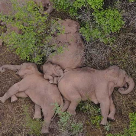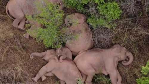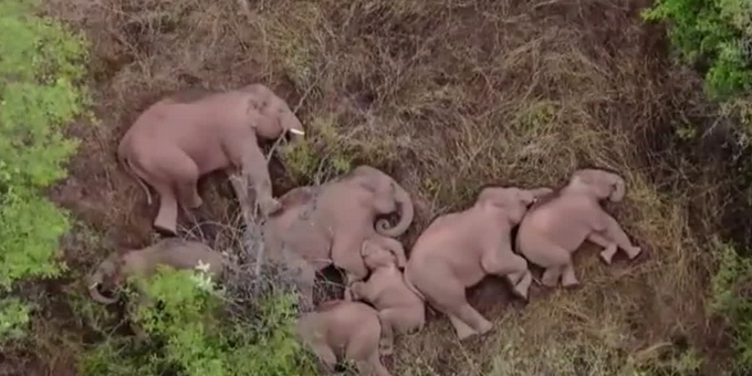 Manada de elefantes toma una siesta tras viaje de 500 km por el sur de China