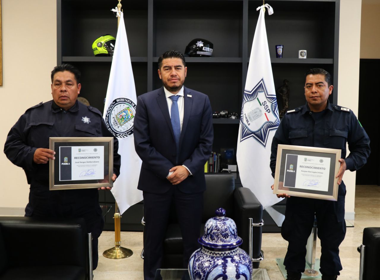 El Secretario de Seguridad Pública del Estado de Puebla, Manuel Alonso García, recibió en las instalaciones del Complejo Metropolitano de Seguridad Pública a los Policías Estatales, Gaspar Barragán Irineo y José Vargas Valderrábano a quienes les entregó un reconocimiento por su vocación de servicio y el compromiso para proteger a las familias poblanas.