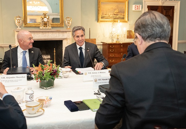 Previo al arranque de la segunda edición del Diálogo de Alto Nivel en Seguridad que se celebra hoy en Washington, Ebrard se reunió en privado con Blinken, encuentro al que siguió una conversación en la que estuvieron sus respectivos equipos de trabajo.