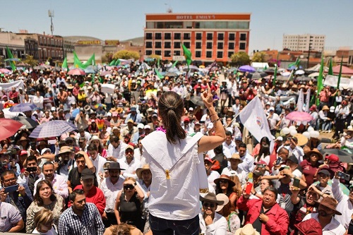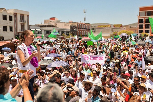 ‘Decidí participar en el proceso de definición de la Coordinación de Defensa de la Transformación por dos razones: el pueblo de México quiere que haya continuidad y porque es tiempo de mujeres’, expresó Claudia Sheinbaum Pardo, en la plaza del Reloj Monumental, en el centro de Pachuca, Hidalgo.