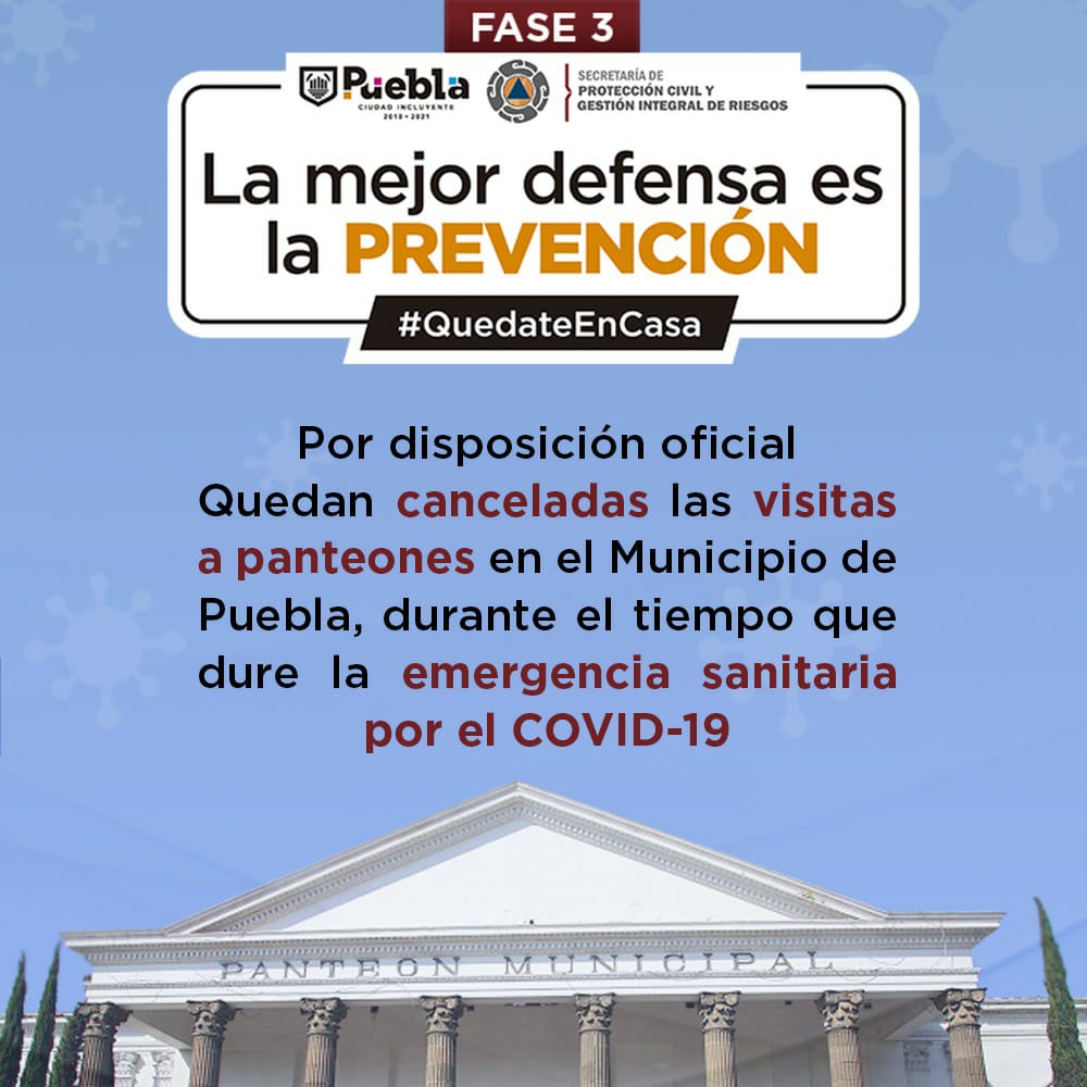El Gobierno de la Ciudad de Puebla reitera el llamado a toda la población a quedarse en casa y, como disposición de prevención ante la Fase 3 de la emergencia sanitaria causada por COVID-19, cancela el servicio de visitas a los panteones municipales por ser puntos de riesgo en próximas fechas.