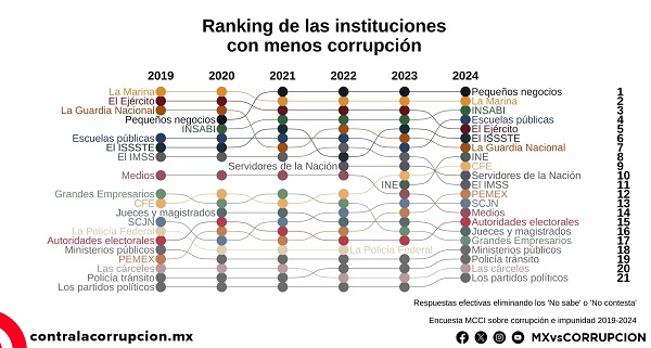 Además, en la Encuesta Nacional sobre Corrupción e Impunidad 2019-2024, cuyo objetivo es conocer la opinión de los mexicanos sobre los aspectos ya mencionados, Pemex avanzó de la posición 19 al lugar 12, lo que representa una significativa mejora en la percepción ciudadana, sobre la integridad con la que desarrolla sus actividades.