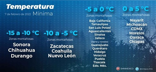 Además, se prevén registros bajo cero en las partes altas de Baja California, Tamaulipas, San Luis Potosí, Aguascalientes, Sinaloa, norte y noreste de Jalisco, Guanajuato, Querétaro, Hidalgo, Veracruz, Puebla, Tlaxcala y el Estado de México, con mínimas que irán de -5 a 0ºC.