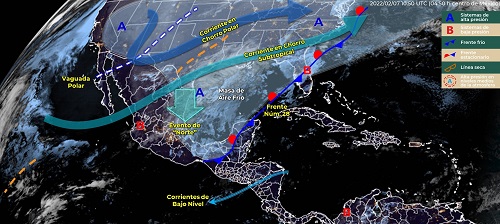 El Servicio Meteorológico Nacional (SMN) explicó que en las próximas horas de este lunes 7 de febrero, el frente se extenderá hacia la Península de Yucatán, dejando ‘lluvias muy fuertes en Chiapas y fuertes en Tabasco, Campeche, Yucatán y Quintana Roo’.