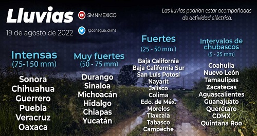 Las intensas lluvias registradas en los últimos días continuarán este viernes 19 agosto de acuerdo con las previsiones del Servicio Meteorológico Nacional. Según su pronóstico, las precipitaciones serán de muy fuerte a intensas en estados como Chihuahua, Guerrero, Puebla, Veracruz, Oaxaca y Sonora.