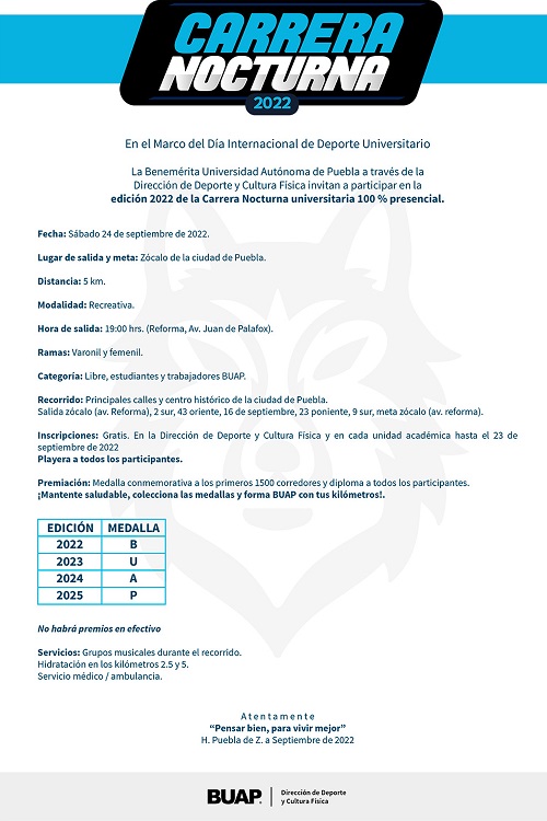 Con motivo del Día Internacional del Deporte Universitario, el próximo sábado 24 de septiembre se llevará a cabo la Carrera Nocturna Universitaria 2022, la cual tendrá como salida y meta el zócalo de la ciudad de Puebla. El recorrido será por las principales calles del Centro Histórico y podrán participar estudiantes y trabajadores de la BUAP, así como público en general.