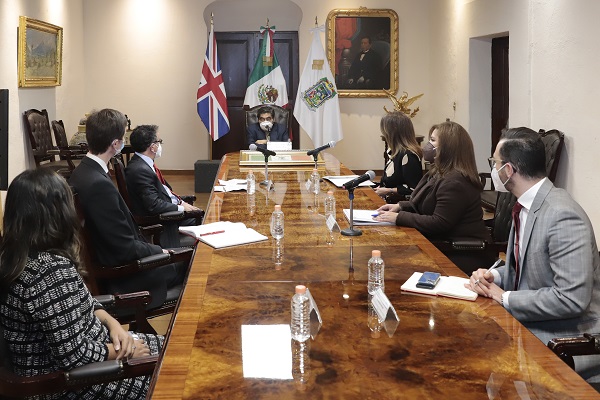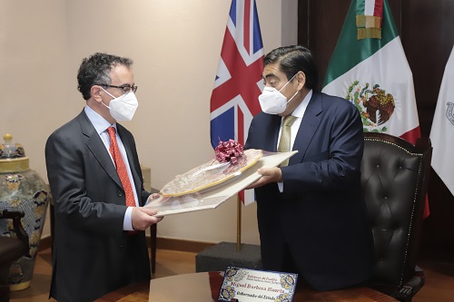 Puebla acompaña y respalda la política exterior impulsada por el Gobierno Federal, a fin de que se traduzca en beneficios directos para las y los poblanos, afirmó el titular del Ejecutivo local, Miguel Barbosa Huerta, al sostener una reunión privada con el embajador de Reino Unido en México, Jon Benjamin.