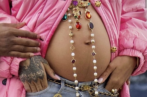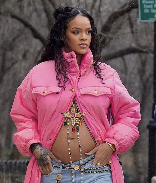 En las imágenes, tomadas por el conocido fotógrafo, Diggzy se puede ver a Rihanna con una chamarra rosa larga, un collar muy largo de diferentes colores el cual resaltaba con el tamaño de su barriga de embarazo y un par de jeans azules.