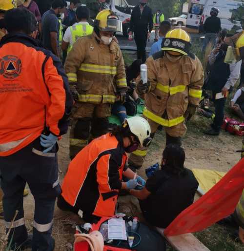 Elementos de Rescate Urbano y el Grupo Relámpagos de Protección Civil Municipal llevan a cabo la mitigación de riesgos, además de brindar atención a las personas lesionadas por impacto vehicular con volcadura en dicha vía.