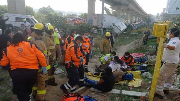 Al menos 17 personas resultaron lesionadas por el impacto de un tráiler a una unidad de transporte público en la autopista México-Puebla a la altura del puente de La María.
