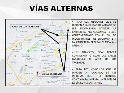 Cabe señalar que los automovilistas pueden utilizar diferentes vías alternas, para quienes se dirijan a Apizaco se recomienda tomar la carretera “La Aguanaja- Belén Atzitzimititlán”, con el fin de incorporarse posteriormente a la carretera Federal Tlaxcala-Apizaco.