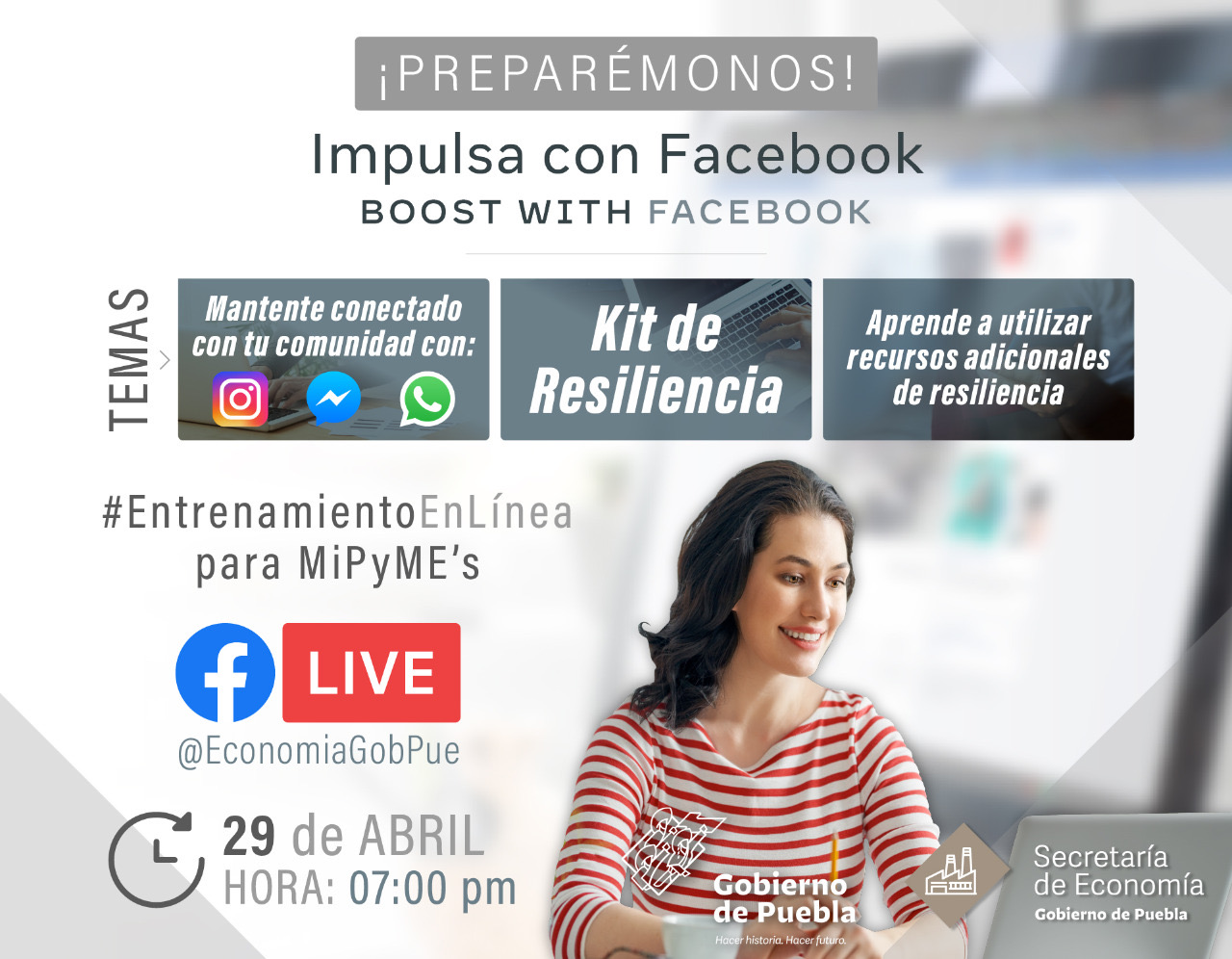Este miércoles 29 de abril a las 19 horas, se desarrollará en la Fan Page de la Secretaría de Economía (https://www.facebook.com/EconomiaGobPue), la transmisión del Facebook Live “Entrenamiento en Línea Impulsa con Facebook”, un taller de resiliencia para empresas, sin costo alguno.