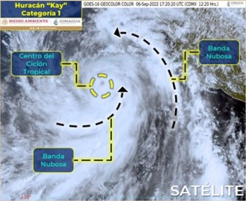 De acuerdo con la más reciente actualización brindada por la Conagua y el Servicio Meteorológico Nacional, el huracán Kay se mantiene como categoría 1, pero su proyección es que se intensifique a categoría 2 antes de acabar el día. Se encuentra ubicado a 515 km al sur-suroeste de Cabo San Lucas, Baja California Sur, y a 555 km al oeste-suroeste de Cabo Corrientes, Jalisco.