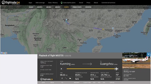 Según datos del portal FlightRadar24, la aeronave volaba a las 14:19 hora local (06:19 GMT) a una altitud de 29.100 pies (8.870 metros) cuando, a unos 55 kilómetros al oeste de la localidad de Wuzhou, comenzó a descender.