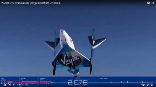 La nave espacial VSS Unity (del tamaño de un jet privado), que viajaba enganchada al avión transportador, se desprendió de la nave nodriza a una altura de cerca de 13 kilómetros y encendió su motor, con el que luego alcanzó la frontera espacial a más de 80 kilómetros de altura.