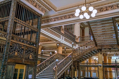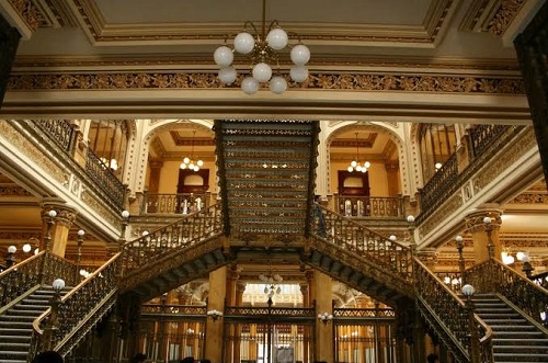 Debajo de las brillantes escaleras de bronce, mirando hacia arriba, se puede apreciar la combinación de estilos arquitectónicos con los que cuenta el lugar, por lo que el sitio es clasificado como ecléctico. Desde ahí de puede apreciar el estilo plateresco y gótico flamígero.